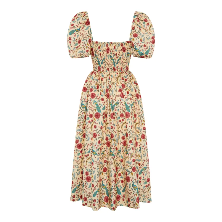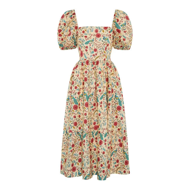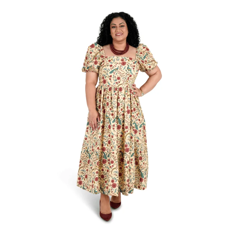 Brighten your wardrobe with our Golden Hour Maxi Dress, crafted in a luxurious cotton-linen blend. The light yellow base is beautifully contrasted with deep reds and greens in a botanical print featuring Peacocks and florals. Designed for petite and curvy bodies, this dress boasts a thoughtfully tailored bust, fitted waist, and sleeves that complement shorter proportions.